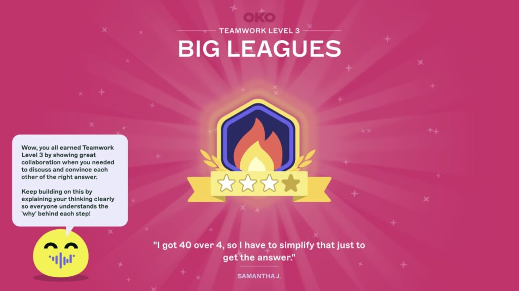 Piloted in a New York and a Georgia school, we integrated Math Narrative recommendations into OKO’s AI facilitation for small group collaborative math activities in order to elevate student agency, acknowledge emotions, affirm the value of mistakes, encourage help-seeking, and reframe struggle.