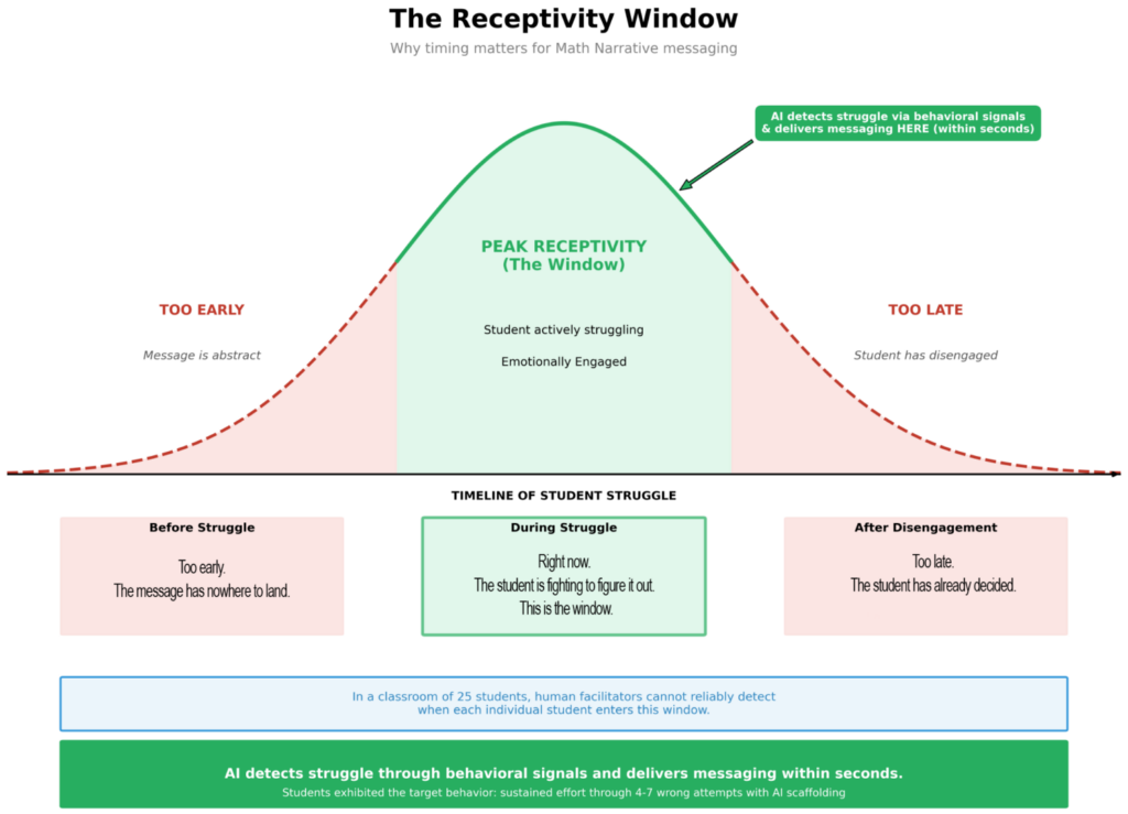 - The best moment to reach a student is the hardest one. AI detects the exact moment a student hits the wall and delivers a message within seconds, inside the peak receptivity window. That is when students are most open to a new belief about themselves. No teacher can reach every student at that moment, at that speed, at scale. AI can.