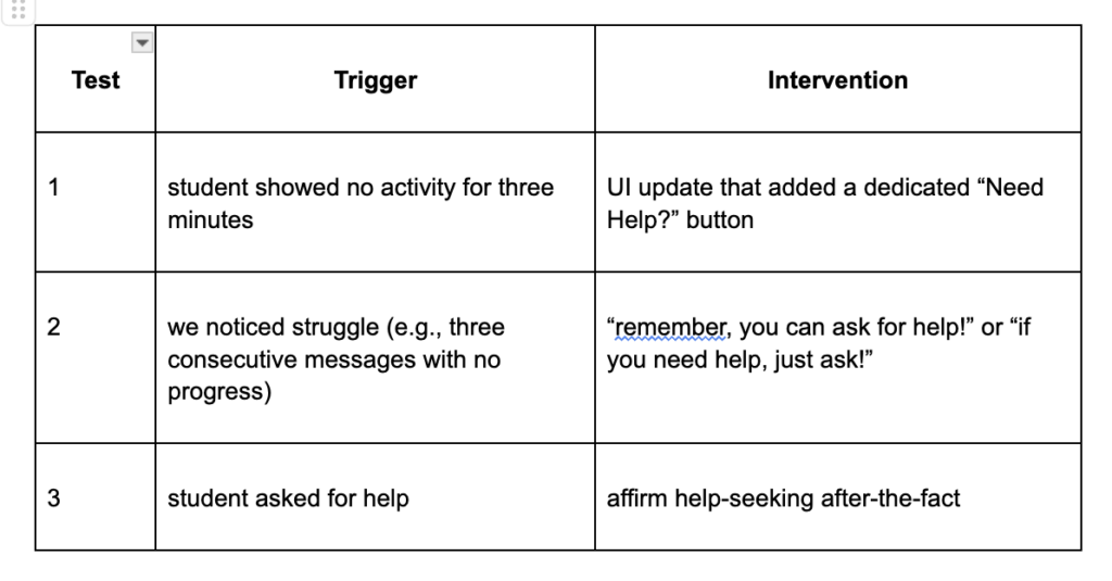 - “Noticing struggle” proactively was a more impactful trigger, by a factor of 2, than responding to student inactivity with a “need help” button, as measured by likelihood to select “strongly agree” to either prompt after receiving either intervention (note: students had to have clicked on the help button).