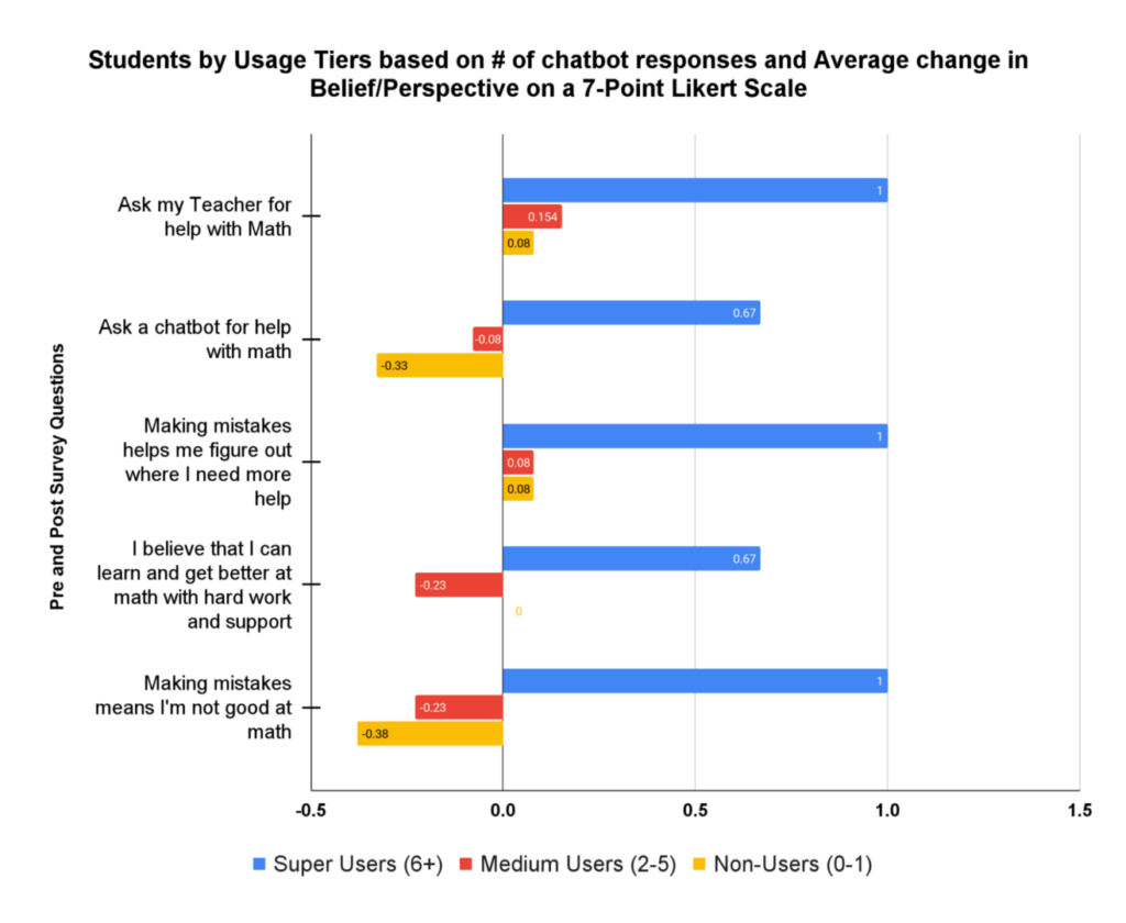 - Beliefs: A 22% increase was observed in students believing they could fix errors with effort, alongside a 12% rise in the belief that asking questions is valuable.