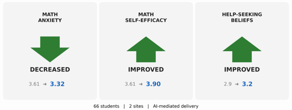 - Help-Seeking Beliefs IMPROVED: 2.9 to 3.2. When the AI made support feel like a normal part of working through a problem, students stopped treating asking for help as a sign of weakness.