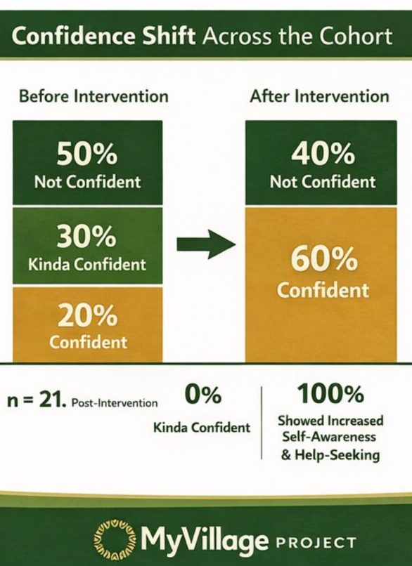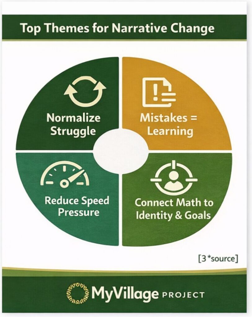 MyVillageProject tested a village model to shift math narratives via near-peers, caregivers, and student tools. Messages normalized confusion, treated mistakes as data, valued help-seeking over speed, and linked math to life. Shifts among 21 Florida middle-schoolers were tracked using reflections and AI.
