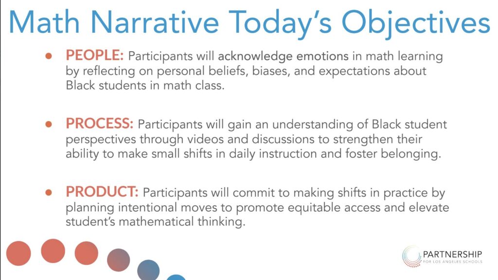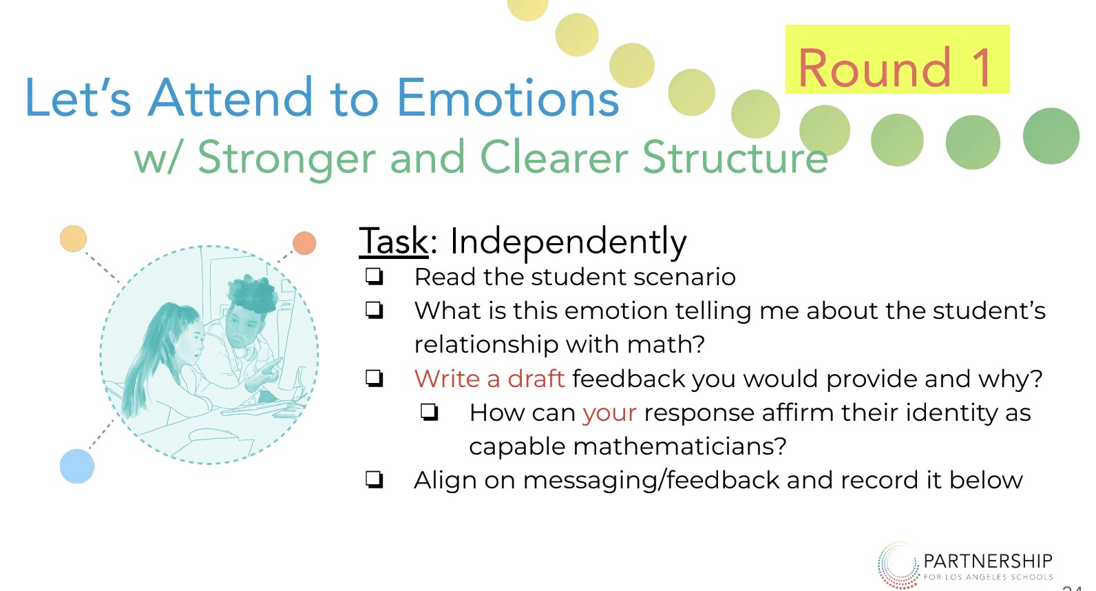 Partnership for Los Angeles Schools embedded student video interview content into a series of professional learning sessions with mathematics educators. The project focused on Emotions in Math Learning (Recommendation) and the Role of Emotions (Belief Pathway) and explored valuing student thinking and maintaining cognitive demand.