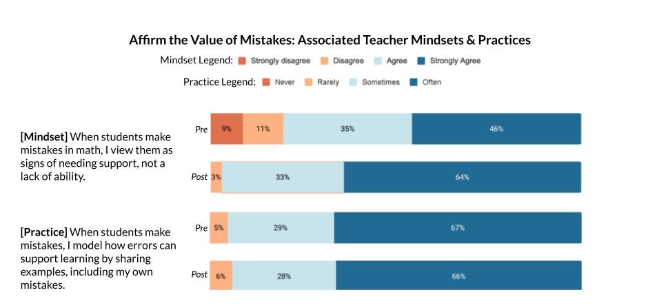 There were high-rates of teacher mindset-related agreement to the three recommendations but that did not automatically translate to practice change. We found the clearest movement in teachers’ reported positive practices related to affirm the value of mistakes. We found small declines in teachers’ positive practices associated with reframe struggle and capability. Teacher self-reported practices related to reassessing assumptions showed limited change.