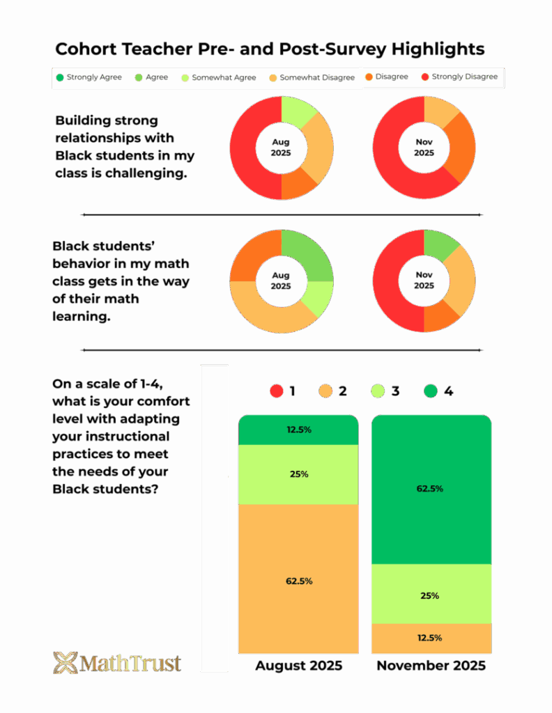 Using videos featuring Black students, MathTrust led a 4-month professional learning series with 8 middle school teachers focused on reassessing assumptions and prioritizing relationship building. Shifts in teachers’ beliefs about Black students was measured using surveys, reflections, and classroom observations.