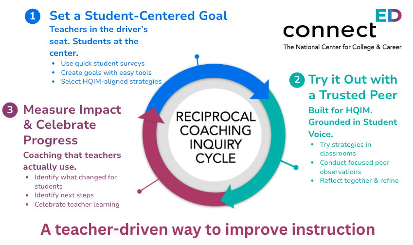 ConnectED integrated math narrative messages (student agency, emotions, reassessing assumptions, and relevance) into the Reciprocal Coaching program, a peer-to-peer structure for teachers to reflect on their practice together. ConnectED worked with 8 teacher pairs in 2 districts and measured impact with surveys, reflective prompts, and focus groups.