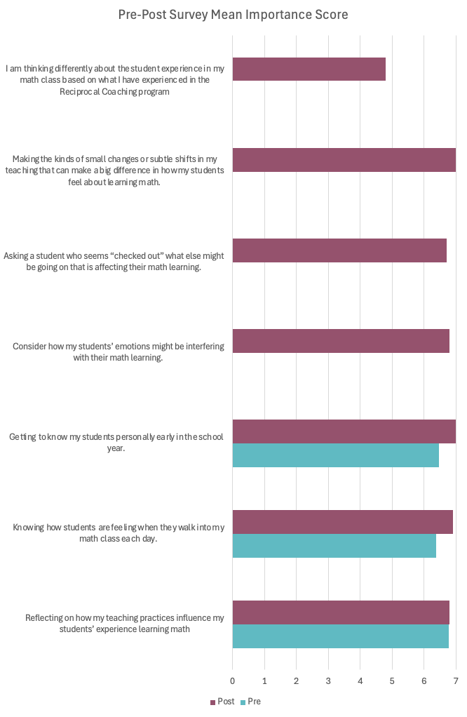 - Quantitative data (pre/post surveys) showed increased agreement that emotions matter in math learning and should be considered when students enter class, reinforcing qualitative findings.