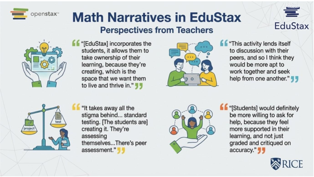 OpenStax embedded math narratives into an AI lesson planning tool to impact teacher and student attitudes on struggle and mistakes. Impact was measured through qualitative and quantitative research with 37 teachers in Texas using pre- and post-surveys and classroom records of teacher behavior.