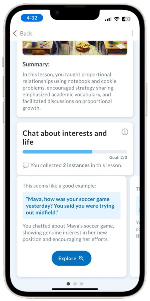 Classroom recordings showed how teachers’ intentions were reflected in practice, while interviews provided insight into teachers’ reflections about the feedback. Teachers reported greater awareness of both their strengths and gaps in relationship-building. The automated feedback allowed them to reflect on the quality of their interactions with specific students.